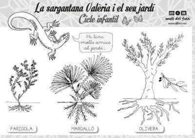 El conte de la sargantana Valèria és el fil conductor de la passejada pel jardí i ens permet conèixer algunes plantes i animals que hi podem trobar: l’olivera, el margalló, la farigola, marietes, formigues, ocells… Finalitzarem l’activitat plantant un plançó d’enciam o julivert en un petit test que cada alumne s’emportarà a casa.